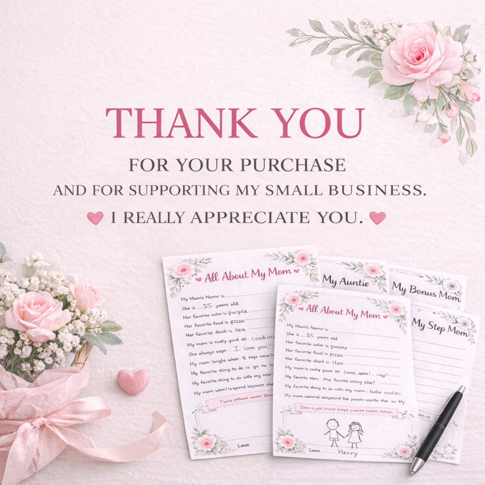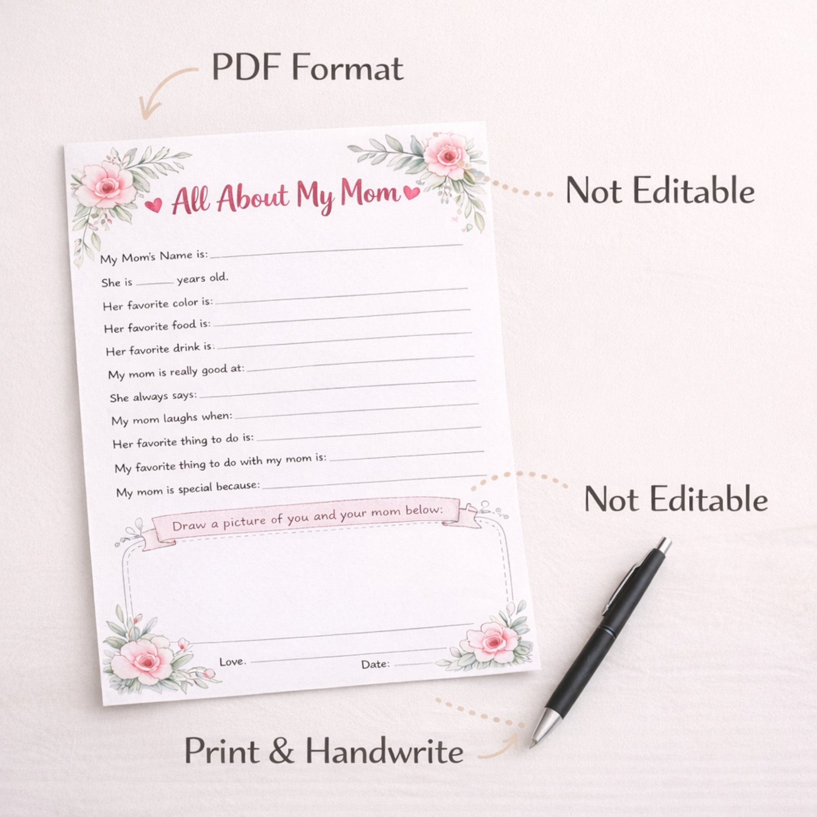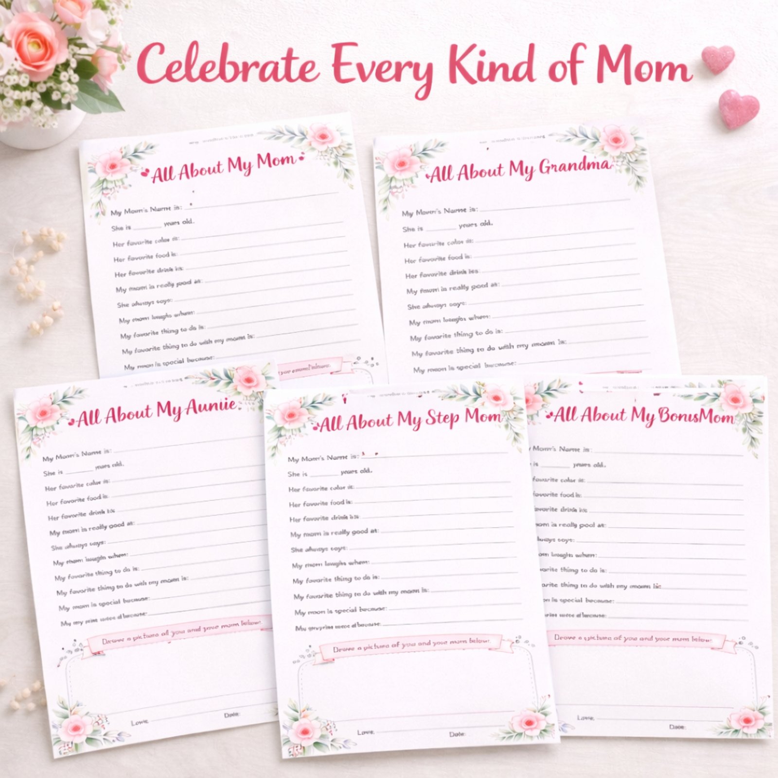 All About My Mom Printable | Mother’s Day Gift | Gift for Mom, Grandma, Nana, Auntie, Step Mom, Bonus Mom | Gift Idea For 1st New Mom