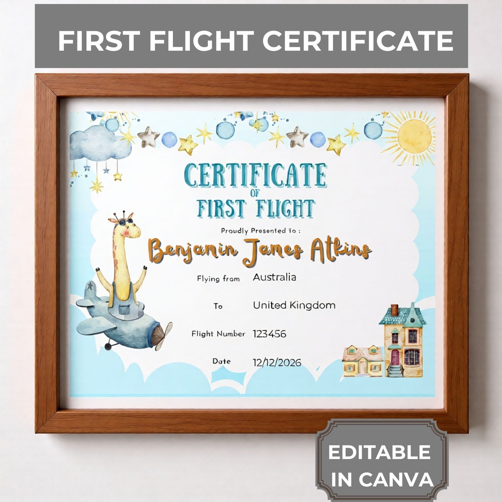 This flight certificate template is fully editable in Canva, making it easy to personalise with your child’s name, flight details, date, and destination. No design skills required. Simply edit, download, and print.